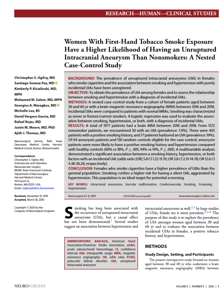 METHODS: A nested case-control study from a cohort of female patients aged between 30 and 60 yr with a brain magnetic resonance angiography (MRA) between 2016 and 2018. Incidental UIAs were compared to patients with normal MRAs. Smoking was characterized as never or former/current smokers. A logistic regression was used to evaluate the association between smoking, hypertension, or both, with a diagnosis of incidental UIAs.