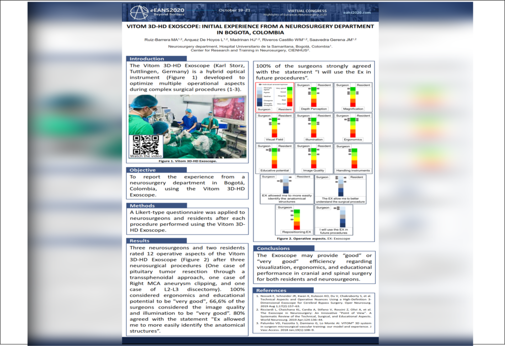 The Center for Research and Training in Neurosurgery of the Samaritana University Hospital (CIENHUS) participated at the EANS Congress 2020 with the project entitled: «VITOM 3D-HD EXOSCOPE: INITIAL EXPERIENCE FROM A NEUROSURGERY DEPARTMENT IN BOGOTA, COLOMBIA» presented by Dr. Miguel Ángel Ruiz, research assistant in neurosurgery at CIENHUS.
