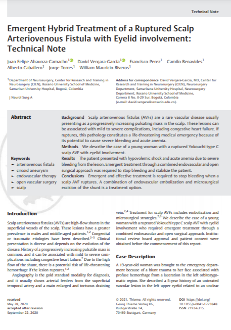 Conclusions: Emergent and effective treatment is required to stop bleeding when ascalp AVF ruptures. A combination of endovascular embolization and microsurgicalexcision of the shunt is a treatment option.