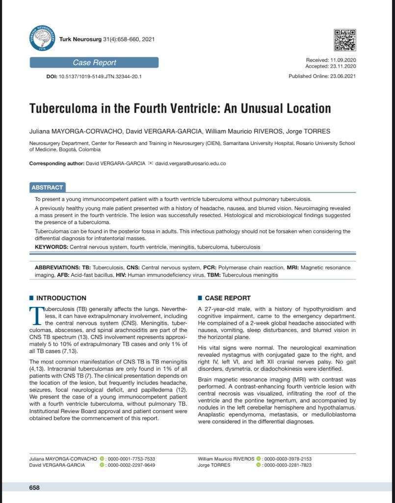 To present a young immunocompetent patient with a fourth ventricle tuberculoma without pulmonary tuberculosis.A previously healthy young male patient presented with a history of headache, nausea, and blurred vision. Neuroimaging revealeda mass present in the fourth ventricle. The lesion was successfully resected. Histological and microbiological findings suggestedthe presence of a tuberculoma.Tuberculomas can be found in the posterior fossa in adults. This infectious pathology should not be forsaken when considering thedifferential diagnosis for infratentorial masses.